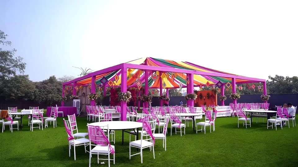 A vibrant open-air venue adorned with colorful drapery and lush green surroundings. The HMC Back Lawn offers a cheerful, spacious setting perfect for daytime weddings, festive gatherings, and lively celebrations filled with charm and style.