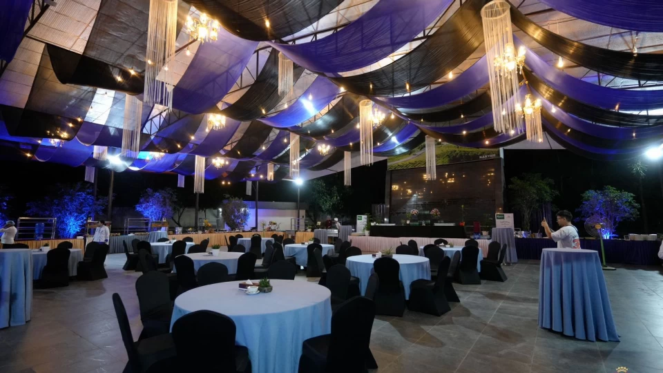 An elegant open-air venue designed for unforgettable celebrations. With stunning drapery, ambient lighting, and a spacious layout, it's perfect for weddings, receptions, gala dinners, and grand gatherings under the stars.